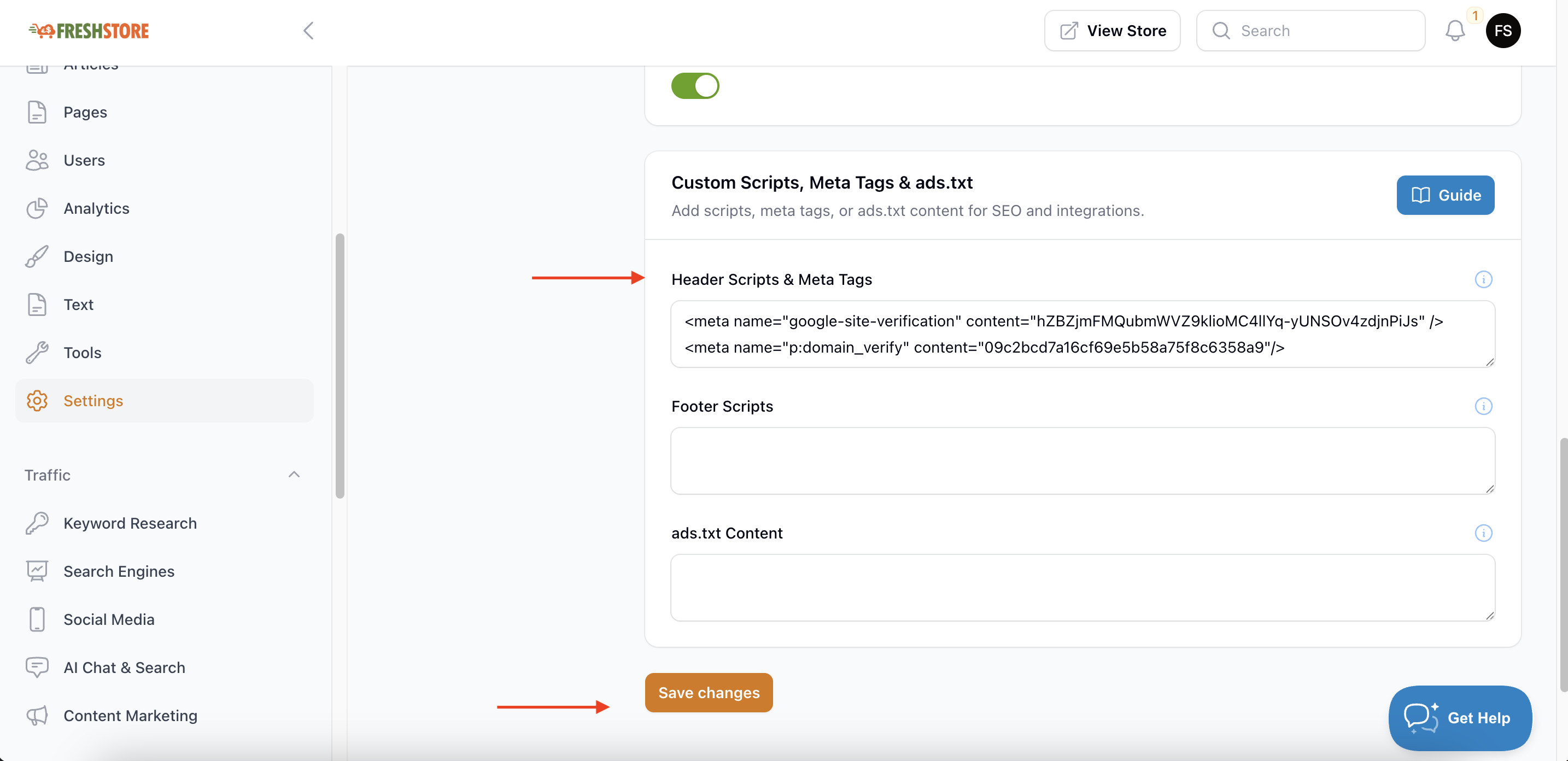 Go to your store admin area, and navigate to "Settings -> Store Settings". Add the copied value into the "Header Scripts & Meta Tags" box.