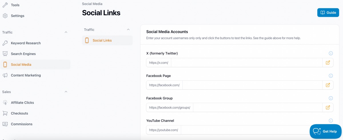 To promote your store, we recommend creating social media accounts for it. You will place your social link handles in your store under "Traffic -> Social Media". Here you can add your X, Pinterest, YouTube, Instagram, Facebook page and Facebook group handle, TikTok, and LinkedIn page handle.