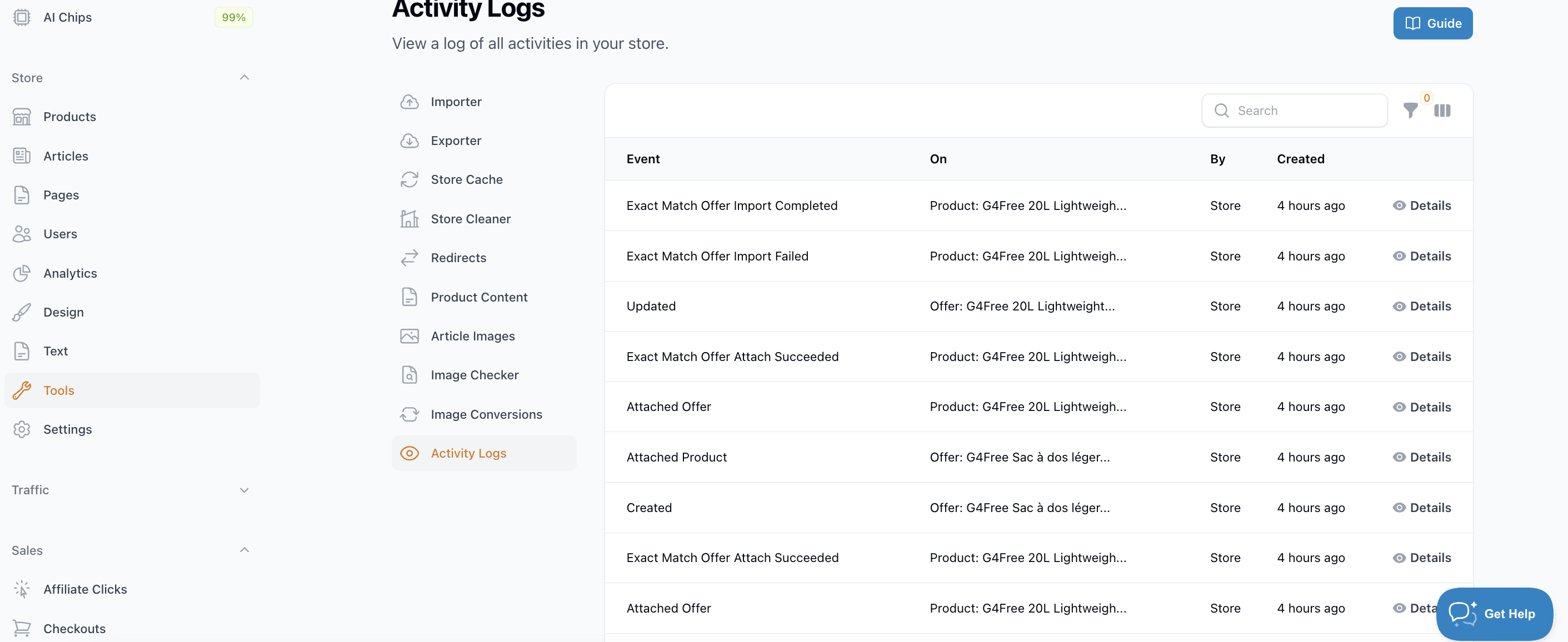 There are also activity logs underneath products, categories, articles etc.. For example, your Category Populators will add to the Activity Log with details like the number of products added.