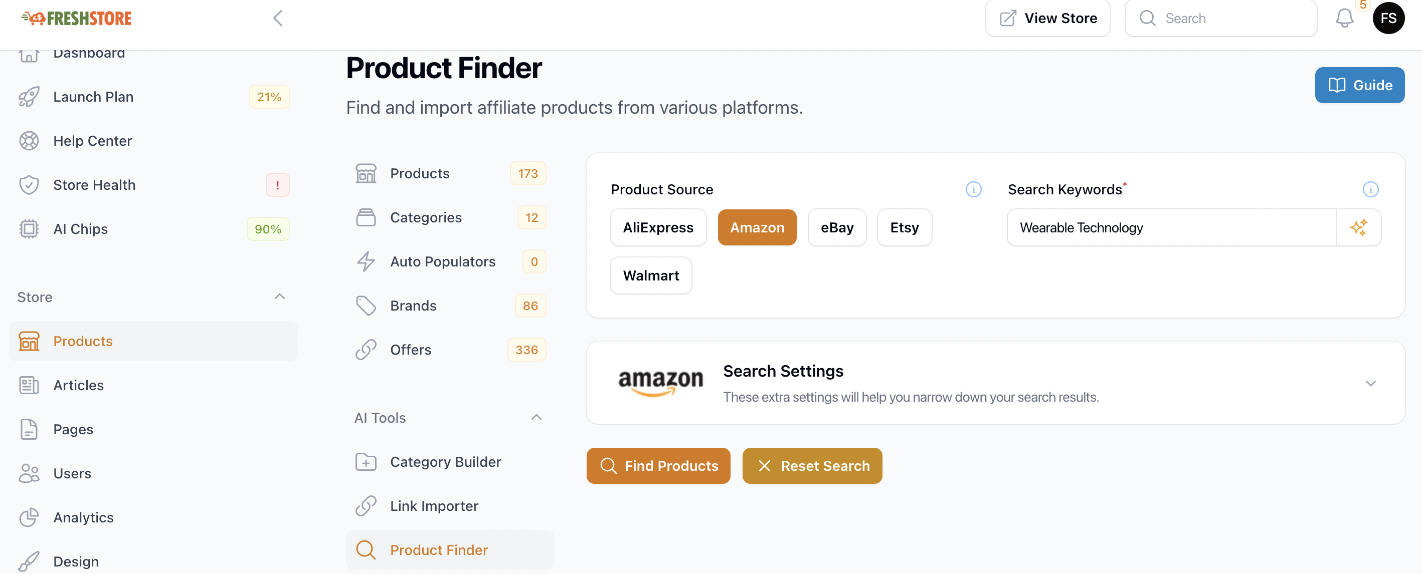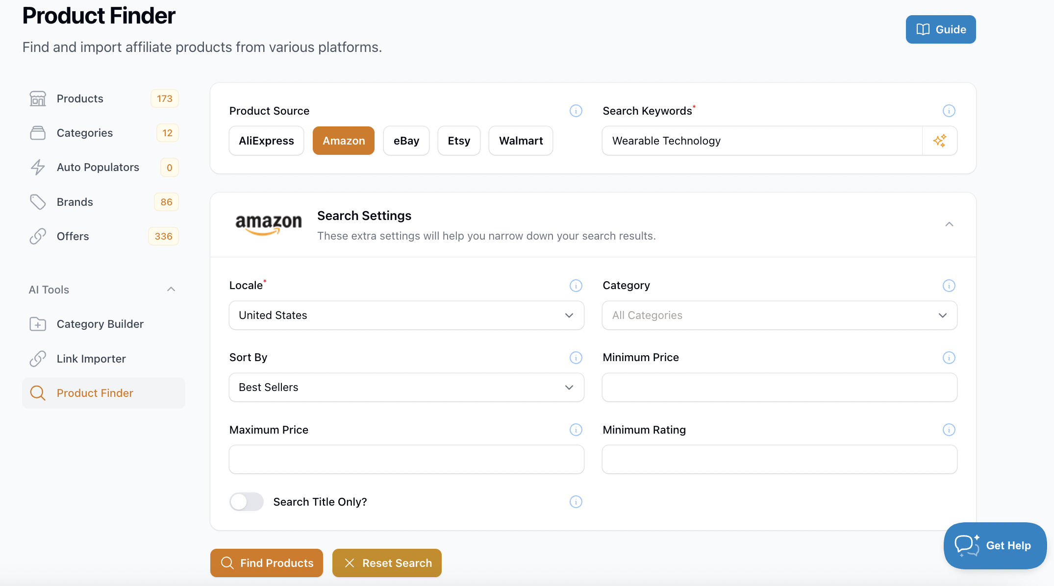 - Select the Product Source you want, type in the Search Keyword and click the Find Products option.