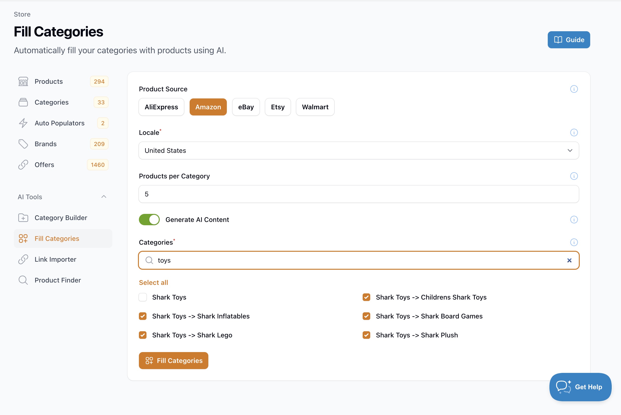 | Categories | Select which categories to fill with products. Use the search bar to find specific categories and the bulk toggle to select/deselect all. | All leaf categories (categories with no subcategories) |